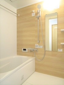 木目調のクロスが落ち着いた印象を受ける浴室になります。