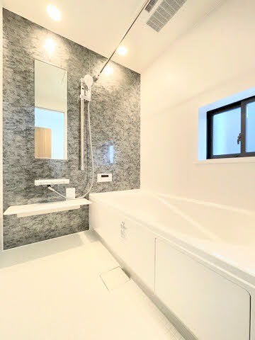 シックなクロスで大人な雰囲気のある浴室です。